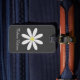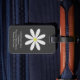 This adorable luggage tag features a textured black pattern. On top is an illustration of a daisy with white petals and a yellow centre. There is room on the front for your name, and room on the back for your contact details. Perfect for your travels!