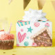 Cute Modern Pink Blue Watercolor Christmas Treats features tasty holiday themed cupcakes with pink froosting and decorated gingerbread houses surrounded by love hearts and sweet lolly treats on a white background.
