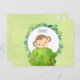 A party thank you postcard with an illustration of a little monkey peeking out from behind a green bush. Surrounded by a wreath of tropical leaves. Set on a green watercolor background. Message on the back which you can personalise with your custom name.