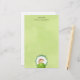 Personalised stationery with a cartoon illustration of a little monkey peeking out from behind a green bush saying hello. Surrounded by a wreath of tropical leaves. Set on an olive green watercolor background. Customisable text at the top says: A NOTE FROM with your personalised name.
