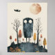 This enchanting nursery poster features a cute and cuddly monster enjoying the sights and sounds of a spooky Halloween night.
