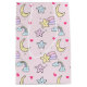 A cute pattern with happy stars, moon, clouds and rainbows on a soft pastel pink background.
