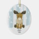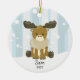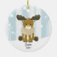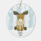 Cute moose Christmas ornament surrounded by winter trees and snow background. Personalise with name and year.