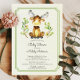 Adorable woodland animals baby shower featuring a adorable watercolor baby moose adorned with green branches with a green frame set on a watercolor texture background for a boys baby shower or neutral baby shower.