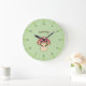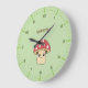 A green wall clock with numbers, an illustration of a cute mushroom in cartoon style customisable text below! This is a great way to make a child's room funny!