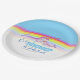 Rainbow baby shower plates, featuring a cute whimsical narwhal watercolor painting. Personalise your baby shower honouring name and date. Other matching items are available. Unique watercolor art and design by Sarah Trett for www.mylittleeden.com