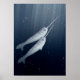 Two narwhal whales with grey spots and colourful tusks swim together in a pod under the ocean water towards the surface for a breath of air. The dark blue ocean with bubbles is lit up by crepuscular rays of light. An original digital graphic art.