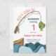 Adorable fishing first birthday invitation with an illustration of a green fish caught in the fishing pole. At the bottom of the invitation your can see a little of the fishing boat at the left among some blue waves. The illustration looks like it's in three dimensions but it's just a print. Illustrated and designed by Patricia Alvarez.
