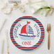 Cute boy's nautical theme 1st birthday personalised paper plates with sail boat, on a white frame and navy and red striped background. Personalise the text yourself when you order. Fun paper plates for nautical theme birthday.