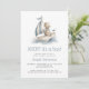 This cute baby shower invitation features a dusty blue and beige watercolor illustration of a teddy bear riding in a sailboat. The words "AHOY! It's a Boy!" and the name of the mom-to-be appear in dusty blue decorative font. Ideal for a nautical-themed boy's baby shower.