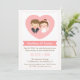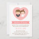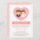 An invitation to invite the wedding guests to a post wedding brunch celebration. It has a cute cartoon of newlyweds, the groom in in a sharp black tuxedo, grey pants and a cheerful pink bow tie and the bride in classy and elegant white dress, veil and a ring of flowers for her hair. A big pink heart shape surrounds them. Reverse page of sweet pink and white chevron pattern.