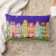 Cute Night Town Walking Cat Pillow. Great for nursery or kids' room. Cute cartoon houses, streetlights, night sky with stars, and black cat walking down the street. Colourful and fun: blue, green, light blue, orange, pink, yellow.