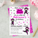Create a memorable and fun birthday celebration for the cute ninja kid in your life. This easily customisable birthday party invitation is part of a matching set of birthday party accessories. You can host the best ninja themed birthday party for your little martial arts enthusiast. Just add your own details to customise, and don’t forget about party plates, cups, napkins, and all the essentials. This design features cute little ninjas wearing black with a hint of hot pink to make your ninja girl happy on her special day.