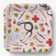 Creative pink nursing school graduation or birthday party plates featuring nursing supplies and flowers.