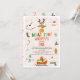 Cute winter Christmas season first birthday invitation featuring a reindeer, Santa Claus, sleigh, snowman and more on a pale pink background. This oh what fun first birthday invitation also features a multicolored heading and is ideal for a girl's first birthday.