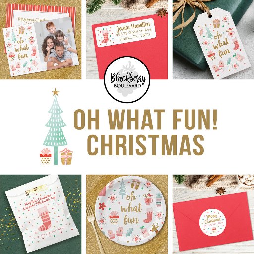 A playful Christmas paper plate design with the message, Oh what Fun. It is decorated with pretty illustrations of presents, mittens, a Christmas stocking, a Christmas tree and a reindeer. A fun party plate for the holiday season. Designed for you by Blackberry Boulevard.