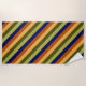 A beach towel featuring a pattern design of multicolored diagonal stripes in olive green, sage green, hazelnut brown, navy blue, and banana yellow.