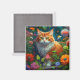 An adorable orange cat with yellow eyes sitting in pretty colourful flowers. Whimsical ai art.