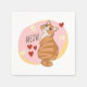 Illustration with cute orange cat seating and smiling, with meow text design and red hearts and paws decoration for cat lovers