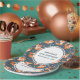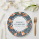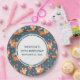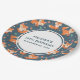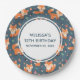 Birthday paper plates with a pattern made with cute and happy orange foxes. Dark green background. Little mushrooms and leaves sprinkled about. A white circle layered over top with your text inside.
