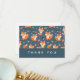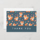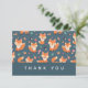 Thank you card with a pattern made with cute and happy orange foxes. Dark green background. Little mushrooms sprinkled about.