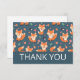 Thank you card with a pattern made with cute and happy orange foxes. Dark green background. Little mushrooms sprinkled about.