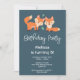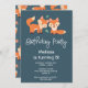 Birthday invitation with a graphic illustration of 2 orange foxes looking cute and happy.