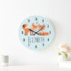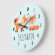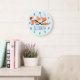 Wall clock with a graphic illustration of 3 orange foxes looking cute and happy. Light blue background. Personalize with a name.