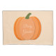 This awesome double sided pillowcase features a digital art image of a cute orange pumpkin with 3 different shades of orange getting darker towards the edges of the pumpkin. There is a green stalk attached to the top. The design is gender neutral making it a perfect design for celebrating a baby boy or girl, especially at Thanksgiving. There is custom text so you can include a message. There are little orange pumpkins on the back so you have 2 designs on one pillowcase.