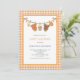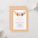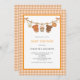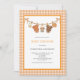 This fall-themed baby shower invitation features an orange gingham border and an adorable clothesline with baby clothes, bib and festive autumn pumpkin, ghost and candy. Back of invitation has the orange gingham. Perfect for a Halloween or fall baby shower. Personalise the text with name, date, location and rsvp information. Great for honouring a mum-to-be during the spooky season.