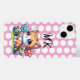 An adorable kitten sitting in a patch of blue and pink flowers and white polka dots personalised phone case.