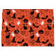 Shows pumpkins, ghosts, witches hats, bats, and spider webs in a seamless pattern. Black and white Halloween objects on an orange background.