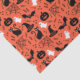 Shows pumpkins, ghosts, witches hats, bats, and spider webs in a seamless pattern. Black and white Halloween objects on an orange background.
