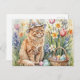This Easter postcard features a charming AI-generated watercolor image of an orange tabby cat in a delightful flower garden. The cat, wearing a spring hat and carrying a basket full of colorful Easter eggs, is sure to bring joy to animal and cat lovers this Easter season.