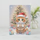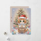The background sets a magical scene with a sparkling Christmas tree, soft falling snow, and elegant pastel roses in blue and pink. This card is perfect for cat moms, kids, or anyone who loves cute animals.