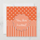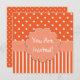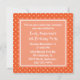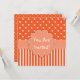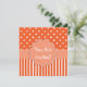 Pretty girl's birthday party invitation done in orange and white patterns. The front has a orange and white polka dot pattern, on top, and stripes, on the bottom, with a light orange band, across the middle that has a large flower like text area, with white text reading You Are Invited! The back is done in orange and white polka dots with a lighter orange square text area, with white text. All text is customisable and ready to personalise for your child's special day. Adorable invitation for any age girl.