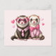 A postcard with a cute illustration. A pair of otters in pink people clothing. Wearing striped shirts and one wearing a tie and the other wearing a bow. Surrounded by love hearts.