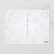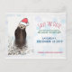 A save the date christmas party postcard. Designed with a nature photograph of a cute otter standing up in the water with his paws under his face. Wearing a red, hand-drawn christmas hat. A snowflake background pattern behind the text.
