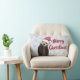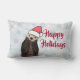 A lumbar pillow with a nature photograph of a cute otter standing up in the water with his paws under his face. Wearing a red, hand-drawn christmas hat. A snowflake background pattern. The front says Merry Christmas. The back says Happy Holidays.