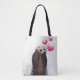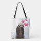 Tote bag with an image of a cute otter with hearts floating upward. The hearts are pink and chubby-looking with a shiny reflection.This otter is quite adorable with his paws resting under his furry little chin. His fur looks wet from hanging out in the water.