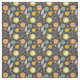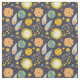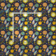 Cute, outer space cartoon seamless pattern on navy blue background. Design include "Outer Space" and "Cosmos" text. Planets, moons, suns, stars, and galaxies also included.