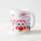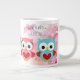 Original painting of two cute owls, one pink for a girl, the other blue for a boy and floral watercolor pink flower blossoms background. "I love you with owl my heart" and "Owl always love you" quotes. You can also personalise it with a name or favourite expression of your own. Jumbo coffee cup.