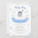 Baby boy winter baby shower invitation. Design features a cute illustrated owl with blue scarf along with blue snowflakes and winter florals.
