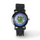 This watch has a vector illustration design with a cute, decorative Owl in green tones on a swirly branch. The background is a blue full moon. The clock numbers design on this watch is a template object. If you like your watch more without them just delete this layer. It is also possible to add text such as a name or initials.