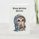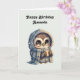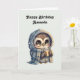Birthday card with a cute illustration of a big-eyed owl in a winter robe and scarf holding a hot coffee.