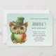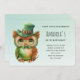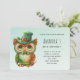 Birthday invitation with a wonderful whimsical illustration. A big eyed brown owl wearing a fancy green top hat and bow tie.