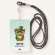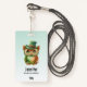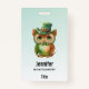 Name badge with a wonderful whimsical illustration. A big eyed brown owl wearing a fancy green top hat and bow tie.