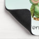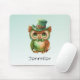 A mouse pad with a wonderful whimsical illustration. A big eyed brown owl wearing a fancy green top hat and bow tie.