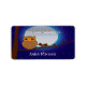 A cute brown owl sitting in a tree at night looking at you. A full silver coloured moon and the dark blue night with stars as background. A bookplate With the text: This book belong to. A template for a name, light grey letters.