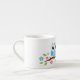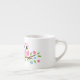 Cute, personalised espresso mug featuring an illustration of two cute owls, one pink and one blue, sitting on a branch with green leaves and blue and pink flowers. Add a name or other text. Cute and fun design for girls and women.